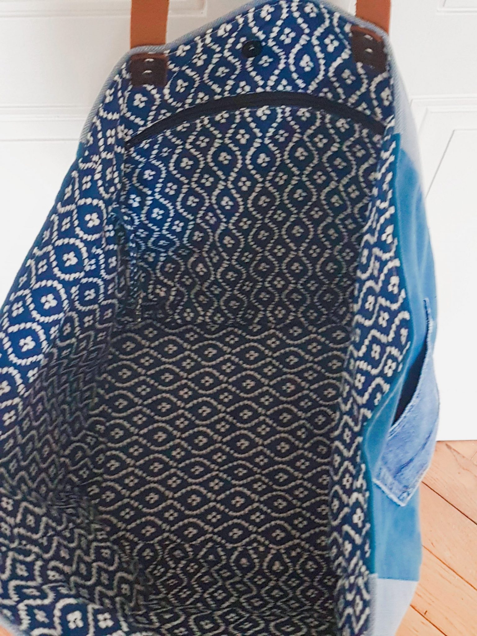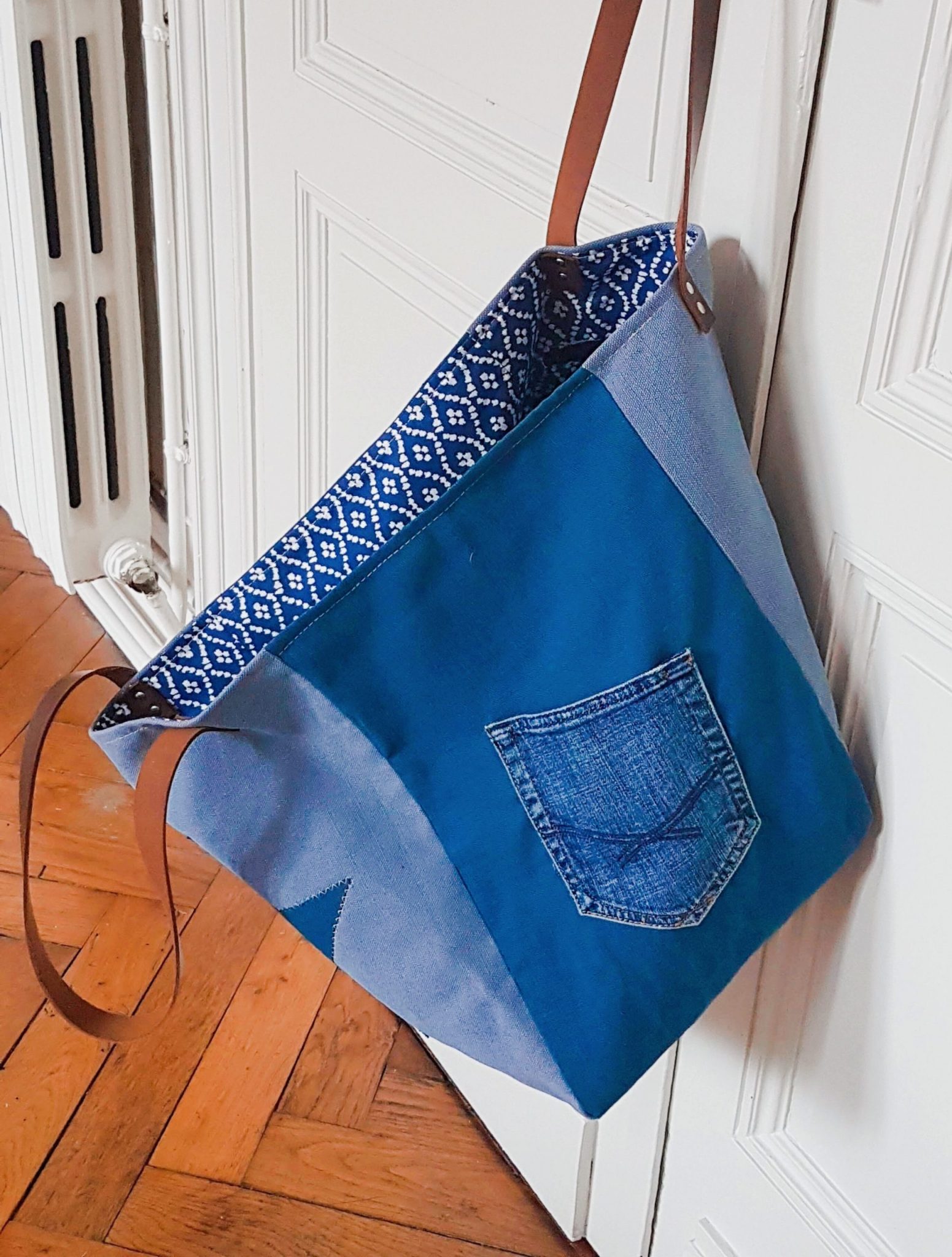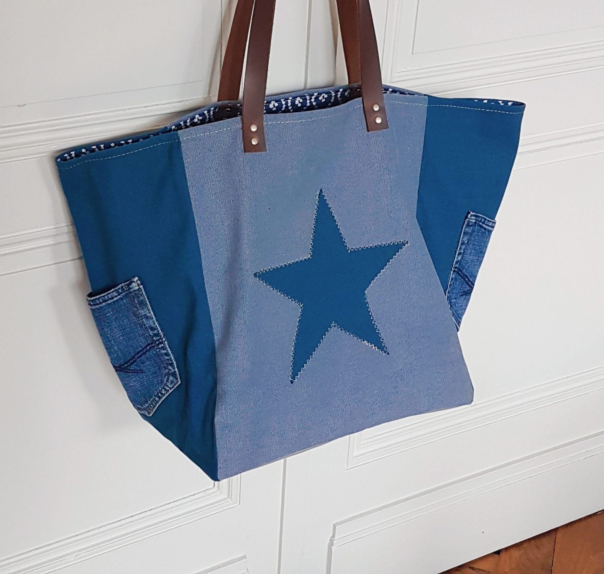 XL est la taille de ce grand cabas bleu et jean, réalisé à partir de tissu en coton dans des tons bleus différents. Une poche en jean est cousue sur chaque côté.