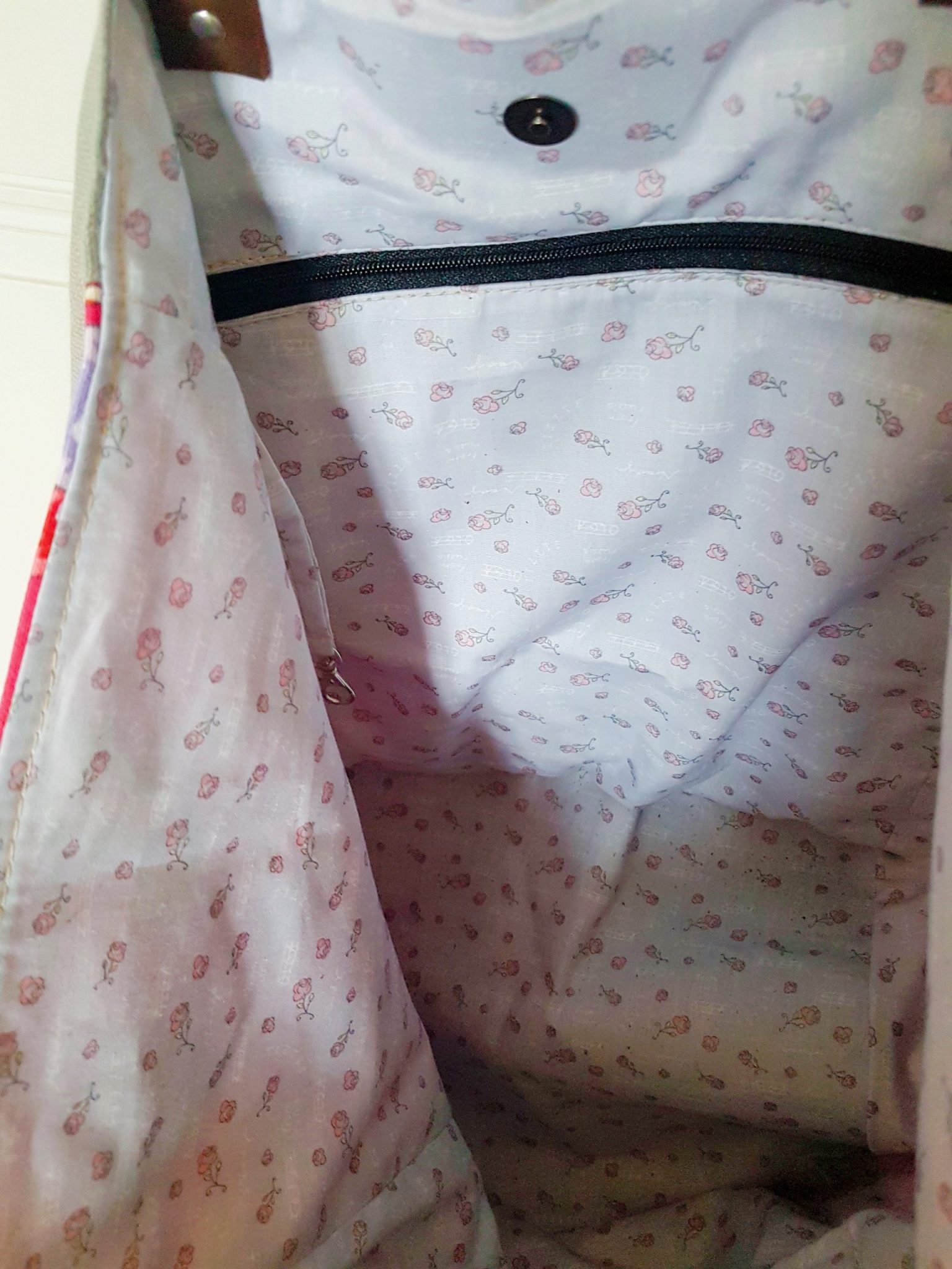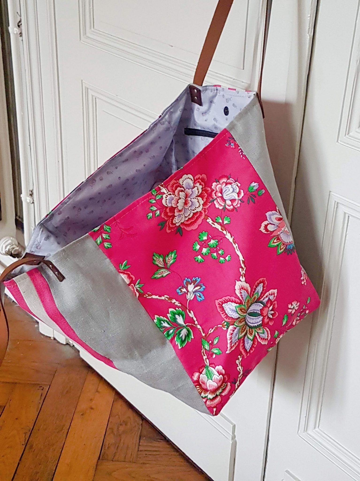Ce cabas XL rose et gris à grosses fleurs est réalisé avec 2 tissus différents. Ainsi nous allons trouver sur l’avant et le dos un tissu gris avec une bande rayé rose et beige. De chaque côté de ce sac, un tissu en coton rose vif avec de grosses fleurs.